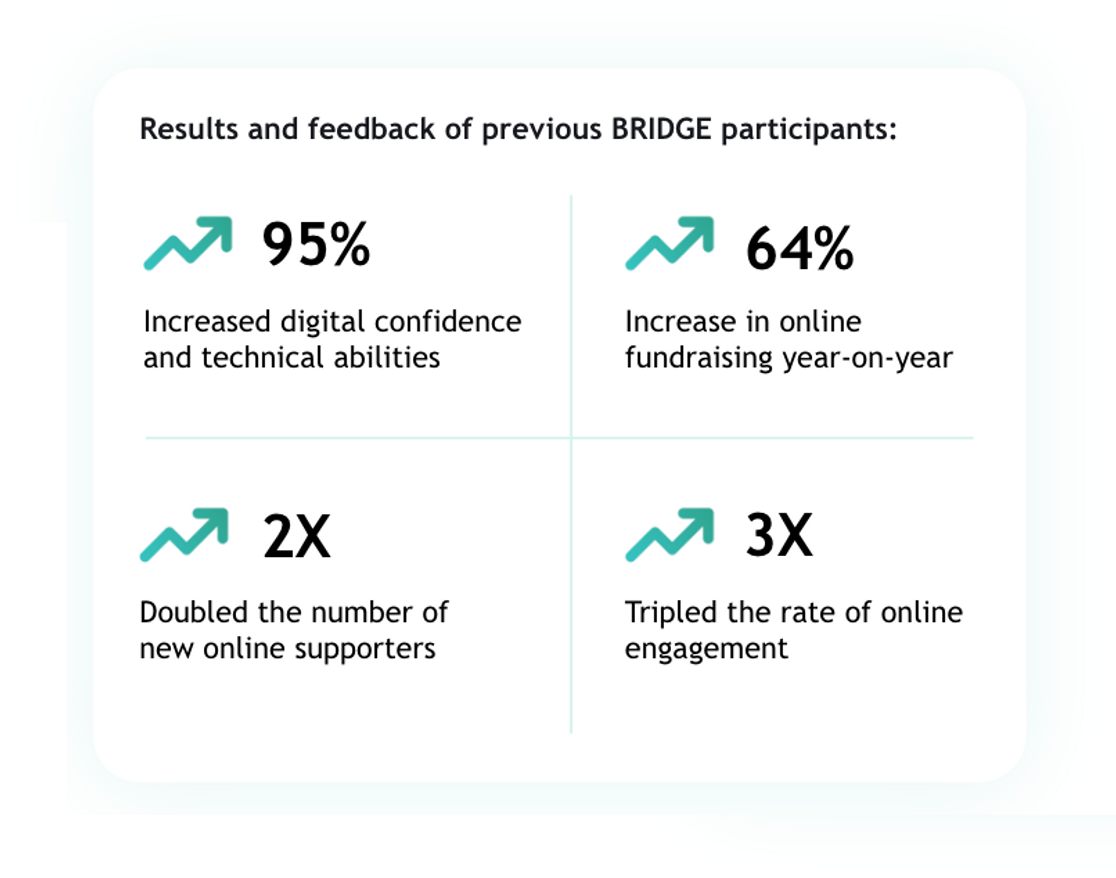 BRIDGE is a tried and tested, results-oriented programme. It builds participants’ resilience by supporting them to be more strategic and tactical online fundraisers. It also makes them more adept at communicating their mission and work across the digital landscape. Ultimately BRIDGE enables nonprofits to better engage with the people and organisations that matter most to them.
